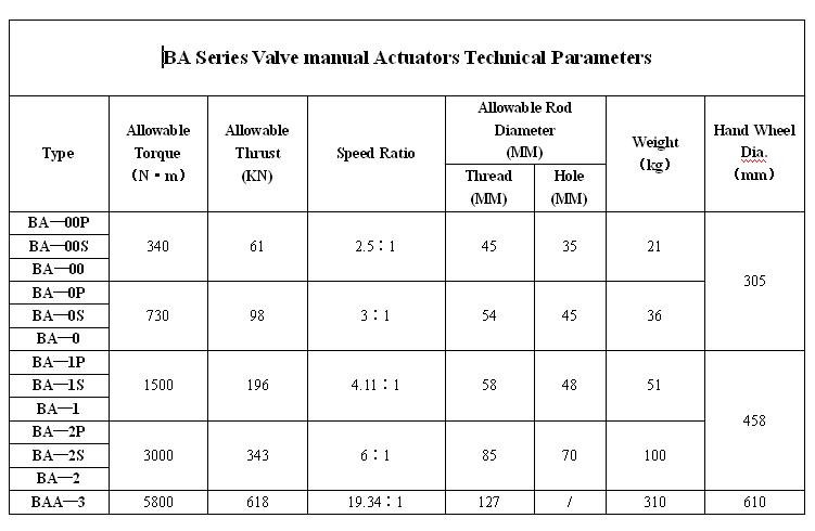 BA series valve manual device, is a multi-turn valve actuators. It is suitable for gate valves, globe valves and other types of valves. Stem nut thread forms and sizes are usually processed by the user depending on their own with the valve. High transmission efficiency, easy to install
