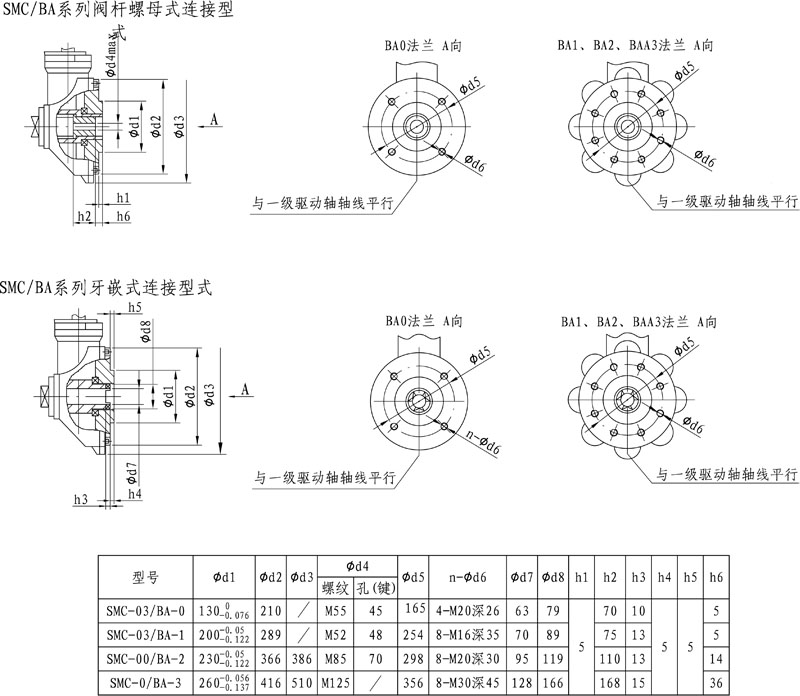 SMC/BA系列電動(dòng)裝置是SMC系列中小轉(zhuǎn)矩多回轉(zhuǎn)電動(dòng)裝置與BA圓錐齒輪減速器的一種組合型式,它適合閘閥、截止閥等多回轉(zhuǎn)閥門的驅(qū)動(dòng)控制。SMC/BA電動(dòng)裝置具有以下特點(diǎn):以較小轉(zhuǎn)矩規(guī)格的SMC電動(dòng)裝置與BA減速器組合可獲得更大的輸出轉(zhuǎn)矩。在輸出轉(zhuǎn)速允許的條件下,選用該產(chǎn)品能夠提高所選電動(dòng)裝置規(guī)格的通用性,便于產(chǎn)品的使用、維護(hù)。